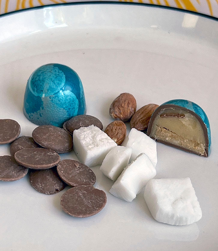 Ingredients: coconut and almond ganache, coconut cookies, coconut and almond paste
