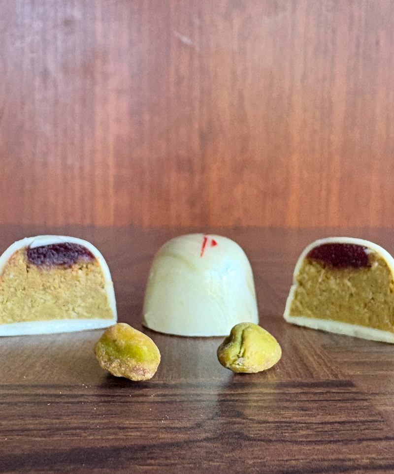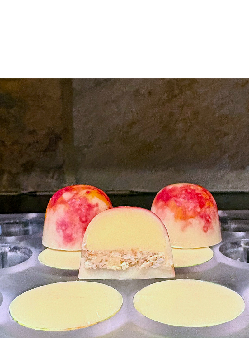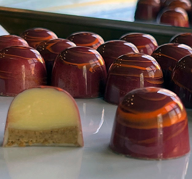 Ingredients: passionfruit ganache, passionfruit coconut, almond paste and feuilletine